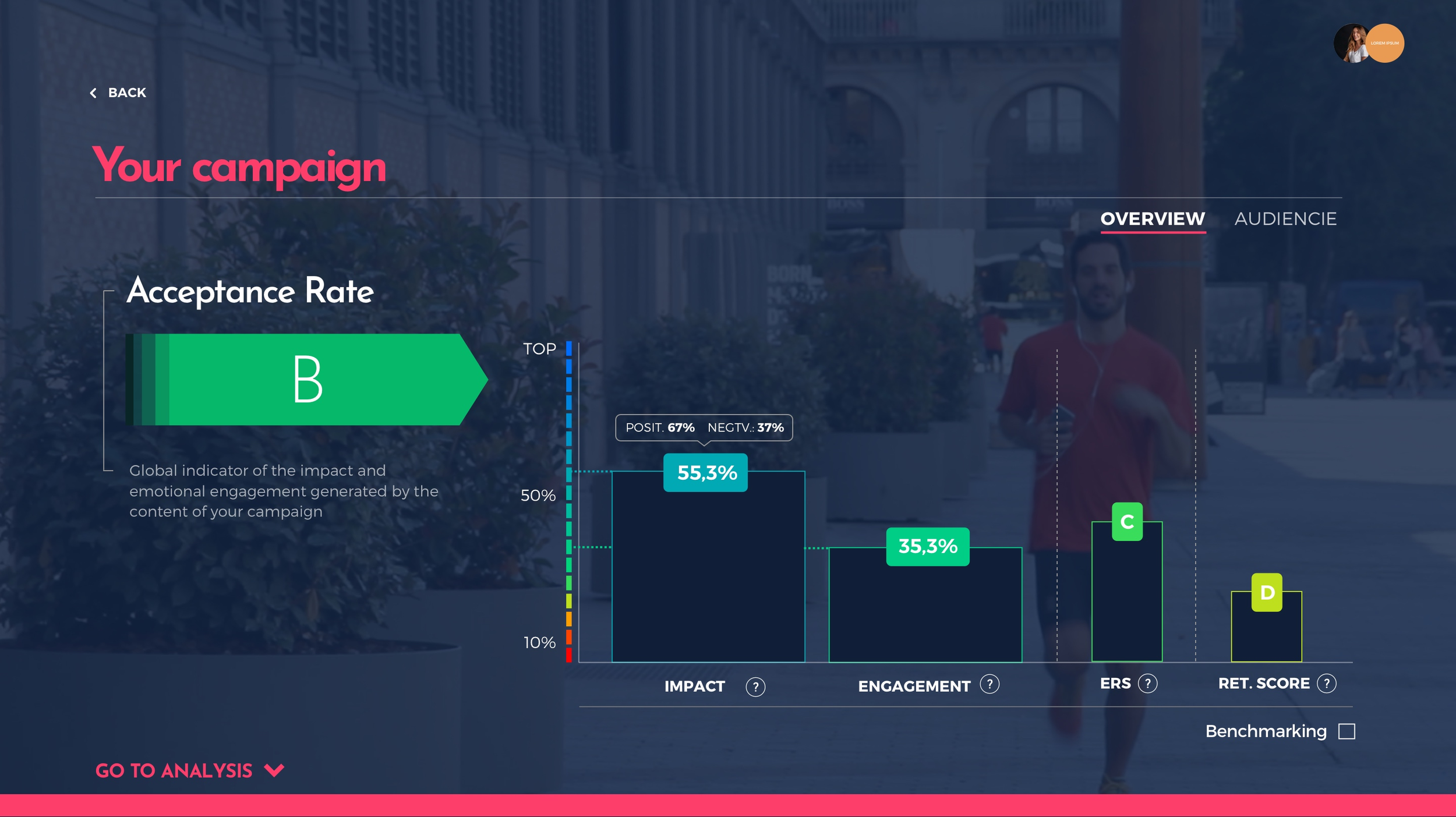 The first level is the overview, an executive view aimed at quickly answering the key question: does this content work or not? Here, aggregated indices and global ratings are presented, allowing for a glance-based comparison of pieces, versions, or campaigns.